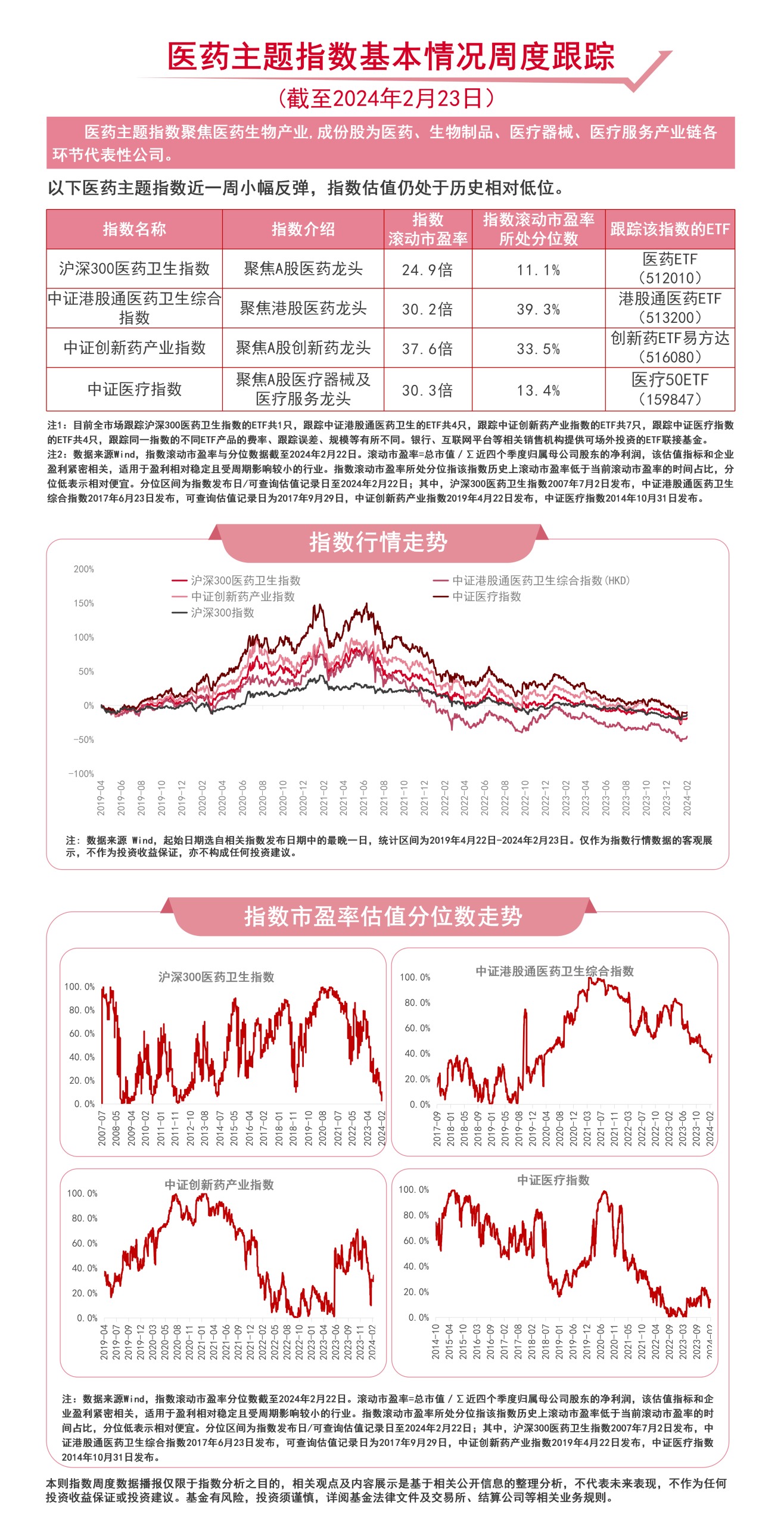 截至周五收盘,本周沪深300医药卫生指数上涨1.4%,中证港股通医药卫生综合指数上涨3.8%,中证创新药产业指数上涨1.5%,中证医疗指数上涨0.2%。
